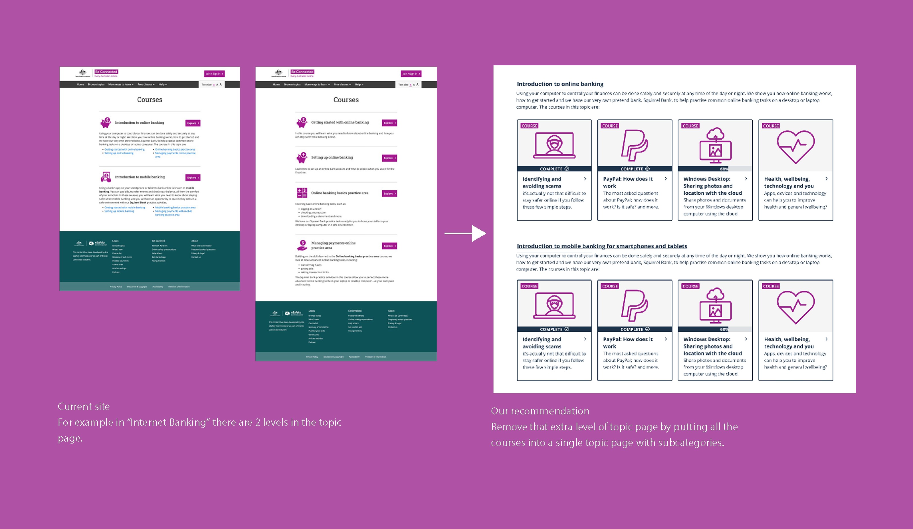 On the current site, some courses within a topic are divided across two separate pages, requiring users to take an extra click to access all content. We recommended replacing the additional page with subheadings on a single page, which would save users time and create a more streamlined learning experience.