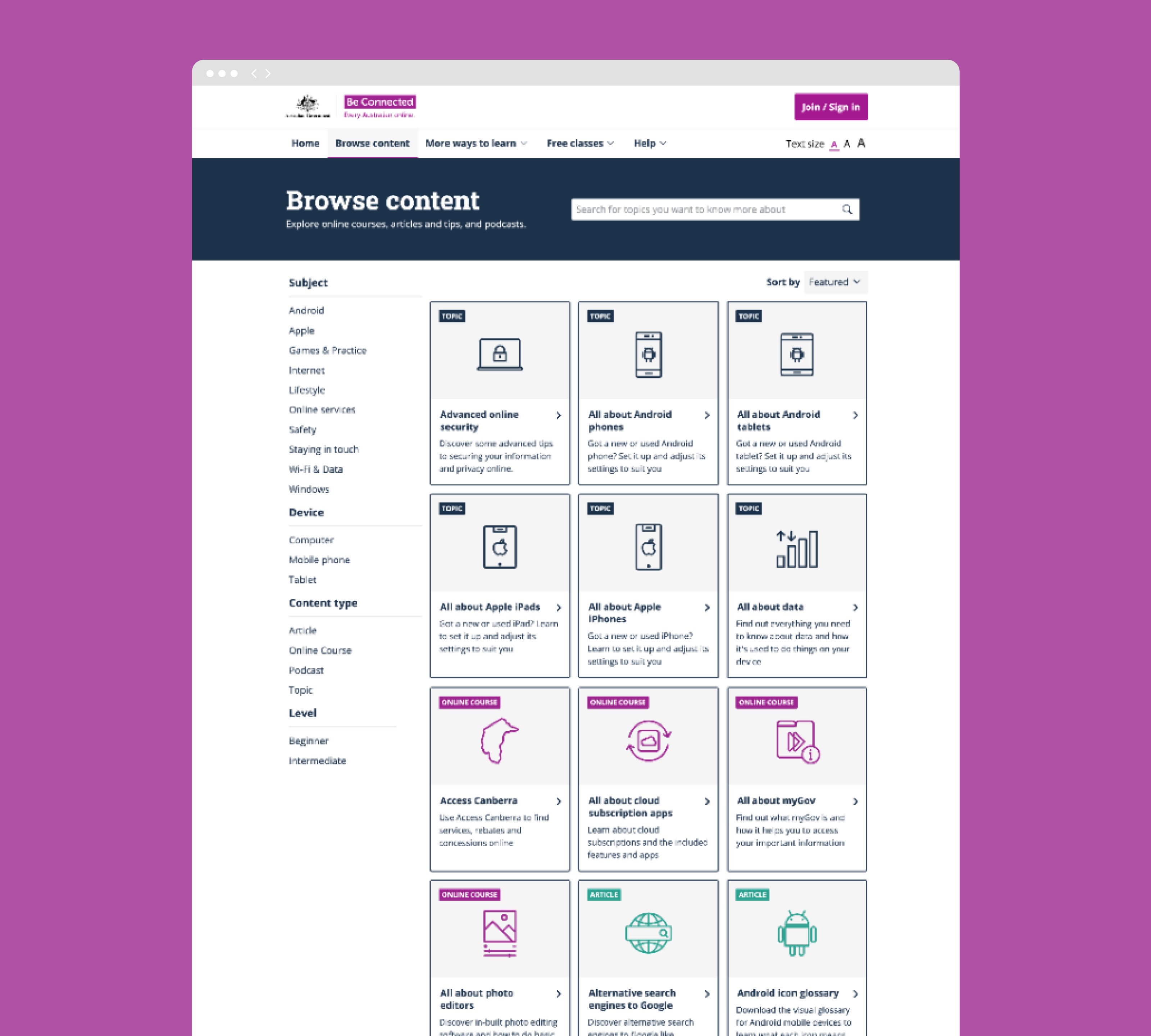 We also evaluated the tile layout and recommended grouping content under clear subheadings such as “Topics,” “Courses,” “Podcasts,” and “Articles.” By default, the catalogue currently sorts by Topics, meaning users who don’t apply filters may only see Topics for an extended time and miss other content types. Dividing the content with subheadings would reduce confusion and allow users to view all content types at a glance, improving navigation and discoverability.