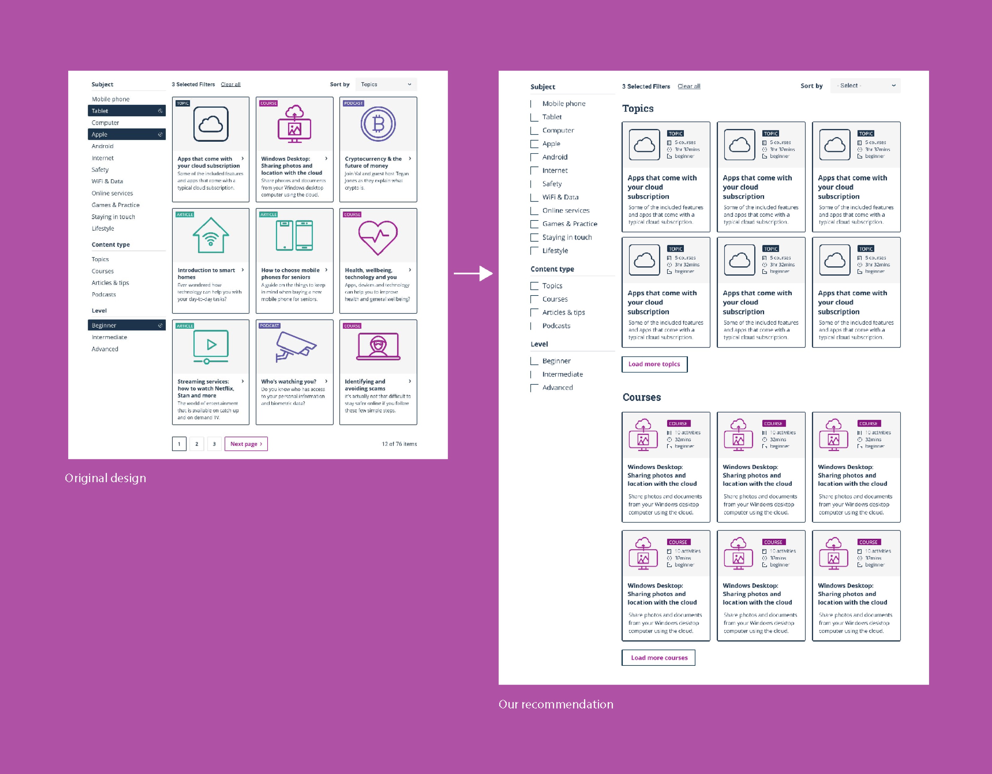 One key focus area was the Browse Content page, where users search for suitable courses. Our analysis revealed that users were often confused by the distinction between course categories, courses, and activity pages, which left them disoriented. To improve usability, we suggested using checkboxes to make it clearer that multiple filters could be applied at once.